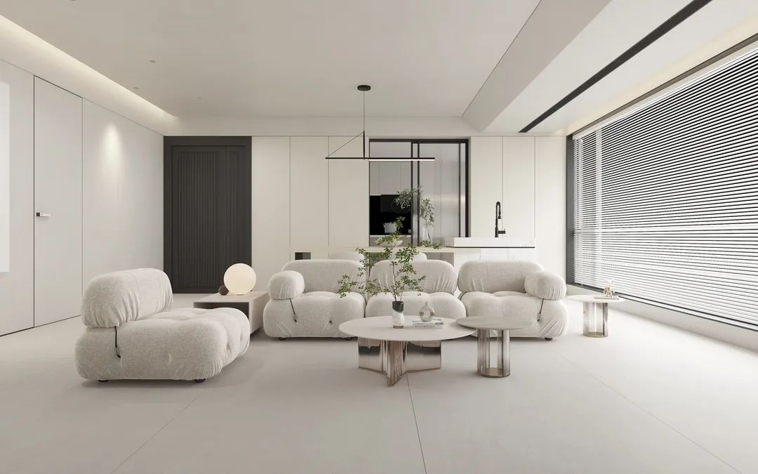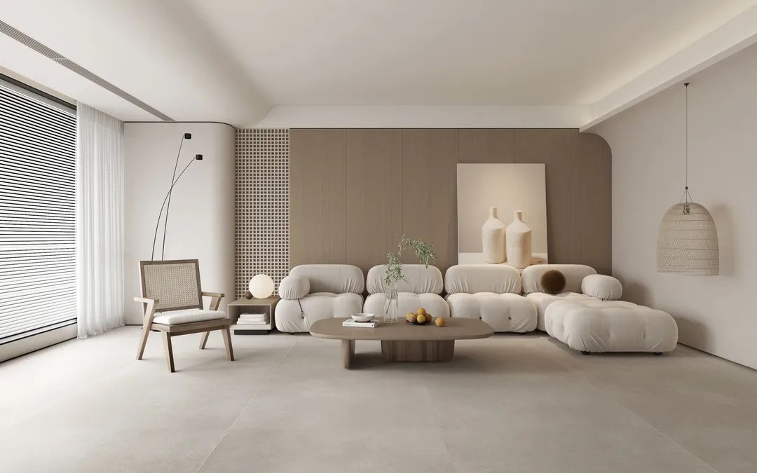作為侘寂風格主要空間——客廳空間(地NME412AS1908)預判了你所有的活動內容,無論你坐、躺、睡、臥、趴、站、跳,都可。